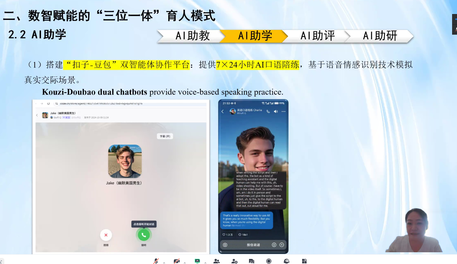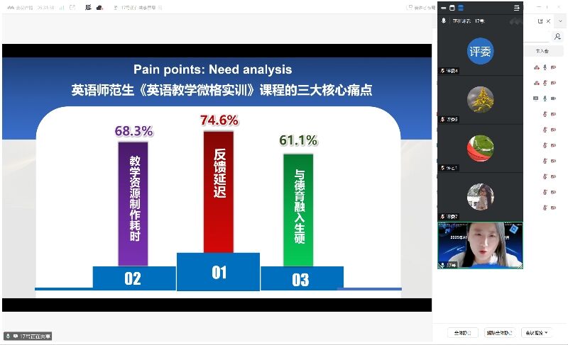 本次大赛由集团公司产品部、公共外语数字教研室研究院联合主办,yl23455永利集团承办,旨在深入推进人工智能技术在外语教学中的融合应用,以技术赋能教学改革,全面提升外语教学质量与教师数字素养。大赛开始于5月,分初赛和复赛。初赛阶段共收到来自十余所高校的逾50项参赛作品。经专家匿名评审,29项作品入围复赛。复赛团队对作品进一步打磨提交后,于8月4日通过在线方式举行复赛。各团队有8分钟说课陈述与4分钟答辩,重点展示了AI技术在外语教学中的具体应用与成效,以及AI赋能的外语教学案例的推广运用价值所在。 经激烈角逐,大赛评出一等奖4项、二等奖9项、三等奖15项。公司罗燕、钟悦欣老师团队提交的《Embrace AI, Empower Teaching, Enrich Learning:数智赋能的“三位一体”育人模式》综合英语课程案例以体系完整、创新突出、实施有效的特点,获得评委组的高度认可,最终以总分排名第一的成绩获得一等奖。公司另一进入复赛的团队,张炜、曾嘉涵老师团队的作品《生成式AI赋能ADDIE教学模型》,凭借突出英语教学微格实训特点,展现公司在师范技能培养方面的创新探索与育人成效,荣获三等奖。