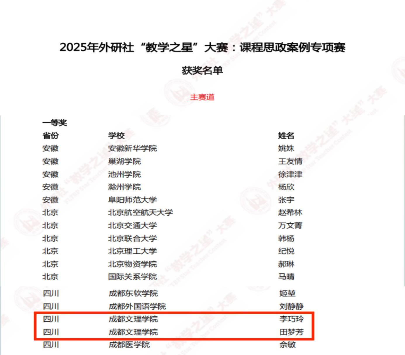 在本次大赛的“课程思政案例专项赛”主赛道中,公司教师捷报频传。李巧玲、田梦芳两位老师荣获一等奖;罗燕、杨阳、余霞三位老师荣获二等奖;陈雅馨、李国萍、罗思琪、钟悦欣、周靓五位老师荣获三等奖。