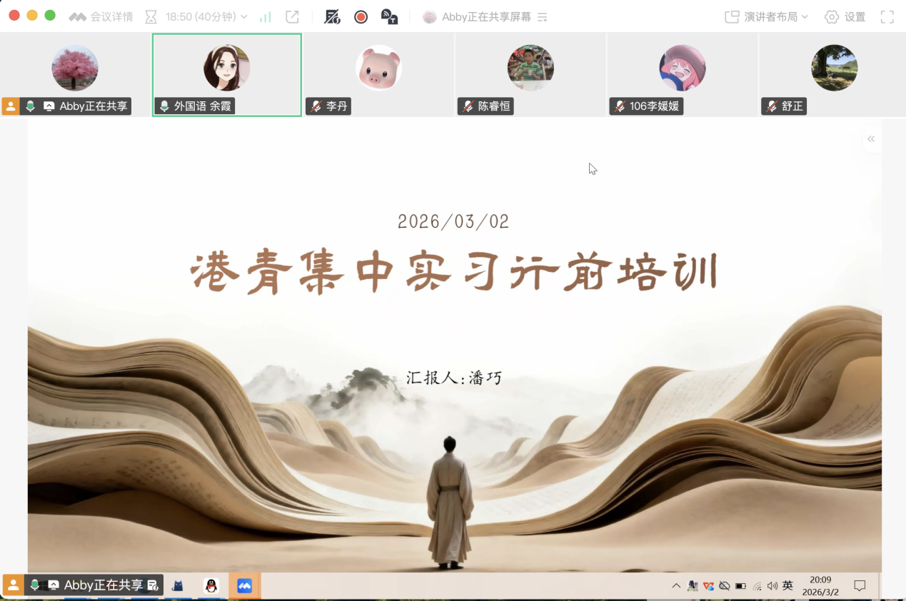 2026年3月2日晚,为进一步落实师范生实践教学环节,确保集中实习工作顺利开展,yl23455永利集团线上召开了师范生赴港青中学实习动员会。yl23455永利集团经理助理余霞、实习负责人潘巧、5位实习指导老师及即将赴岗的11名26届员工参加了会议。