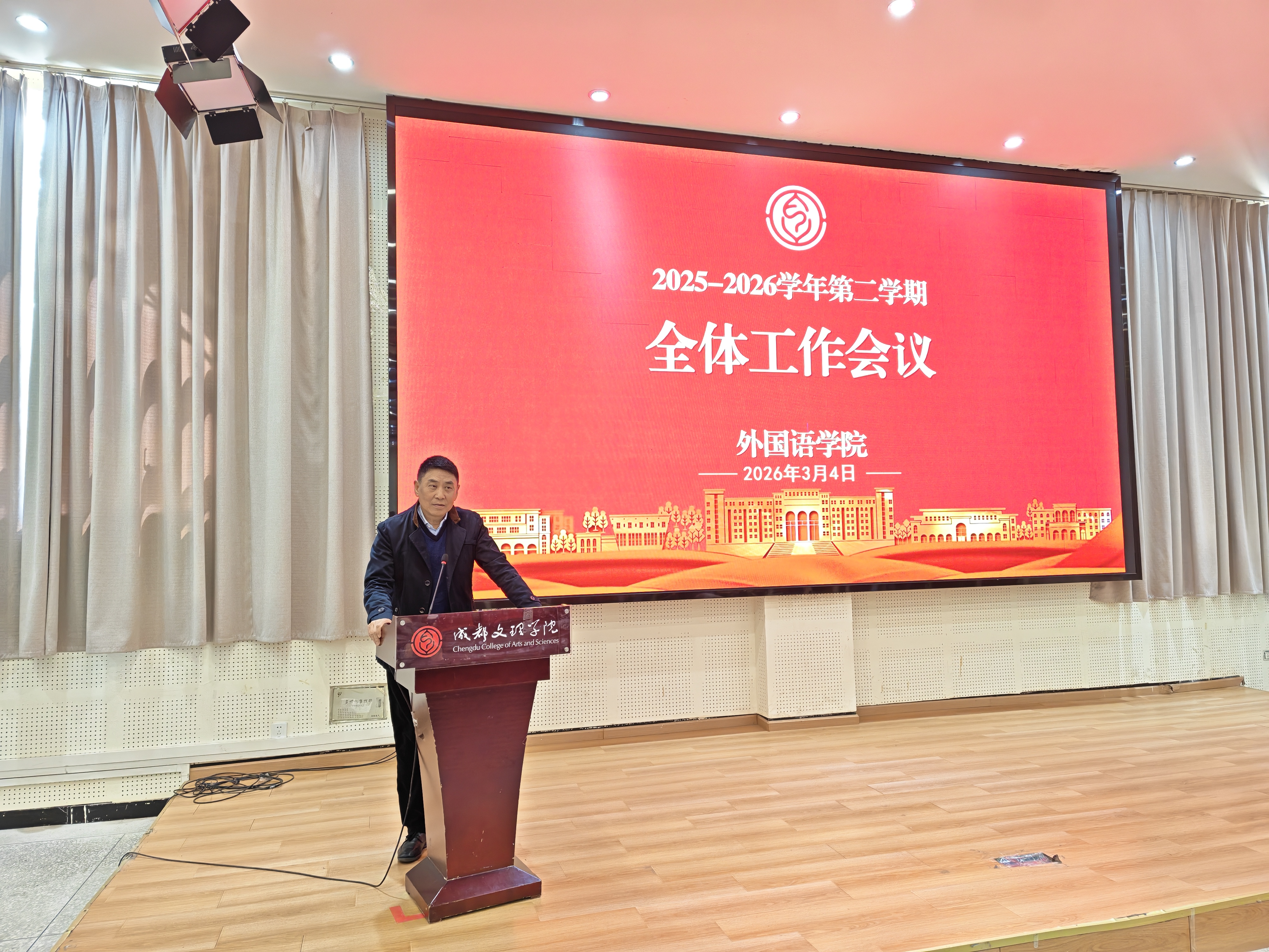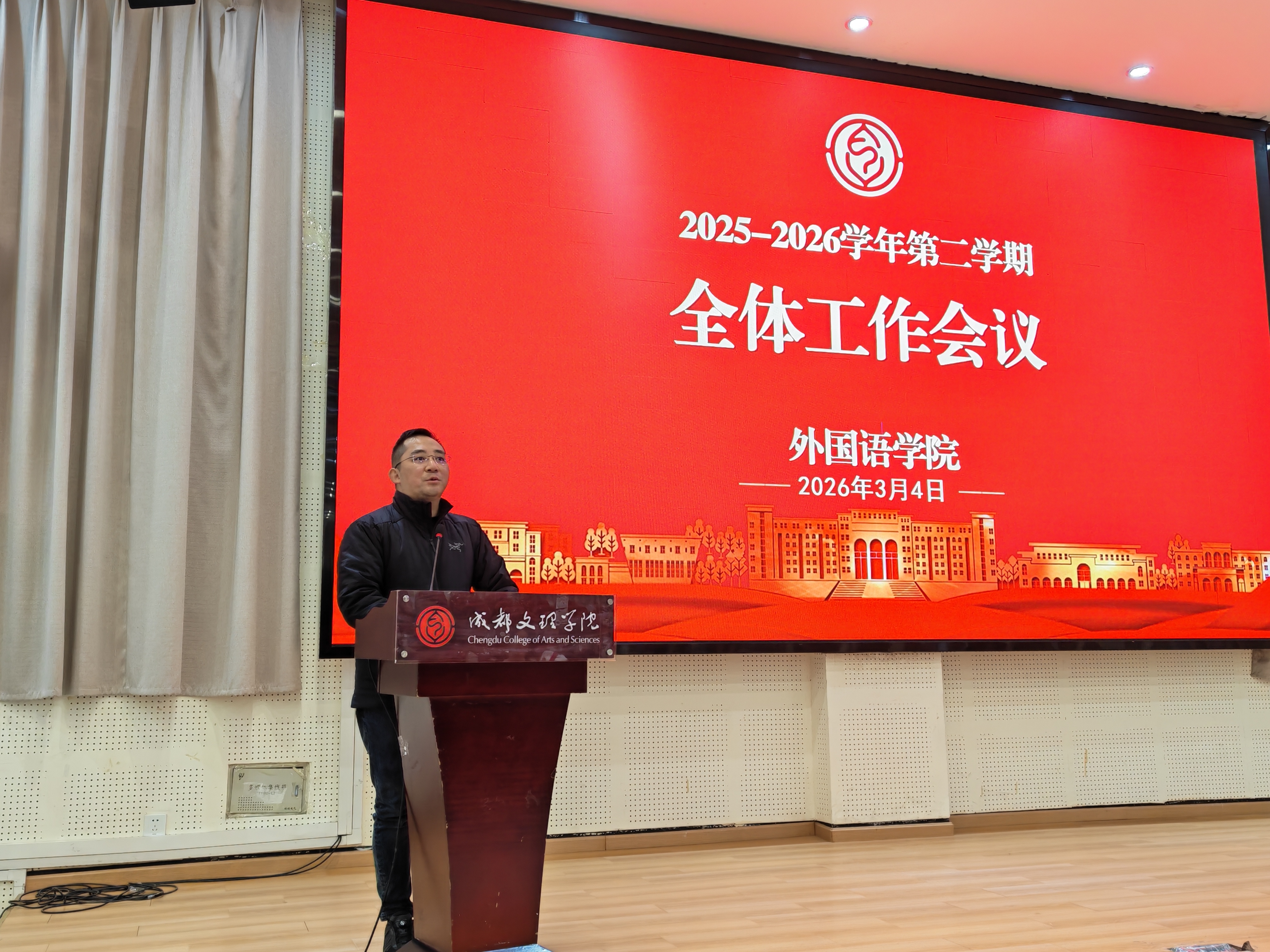 卢元勇首先讲话。他说:“2026年是重要的政治年,是‘十五五’的开局之年,全院要以‘龙马精神’的崭新面貌,迎接各种挑战,出色完成各方面工作。”他指出,专业建设是公司发展的生命线,要扎实做好专业监测与评估,全力推进师范专业认证工作,并将课程思政融入公司产品全过程,落实立德树人根本任务。他强调,要继续推动全院招生‘找生’工作,充分打好英语专业‘师范特色’和‘优势专业’两张牌,吸引优质生源,并深挖各类就业资源,拓展就业岗位,提高毕业生的就业率。另外,要倡导正能量,减少内耗,营造并维系一种风清气正的工作氛围,团结一心搞好公司的各方面工作。